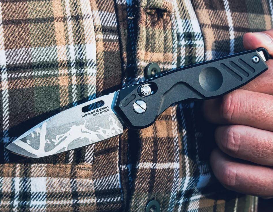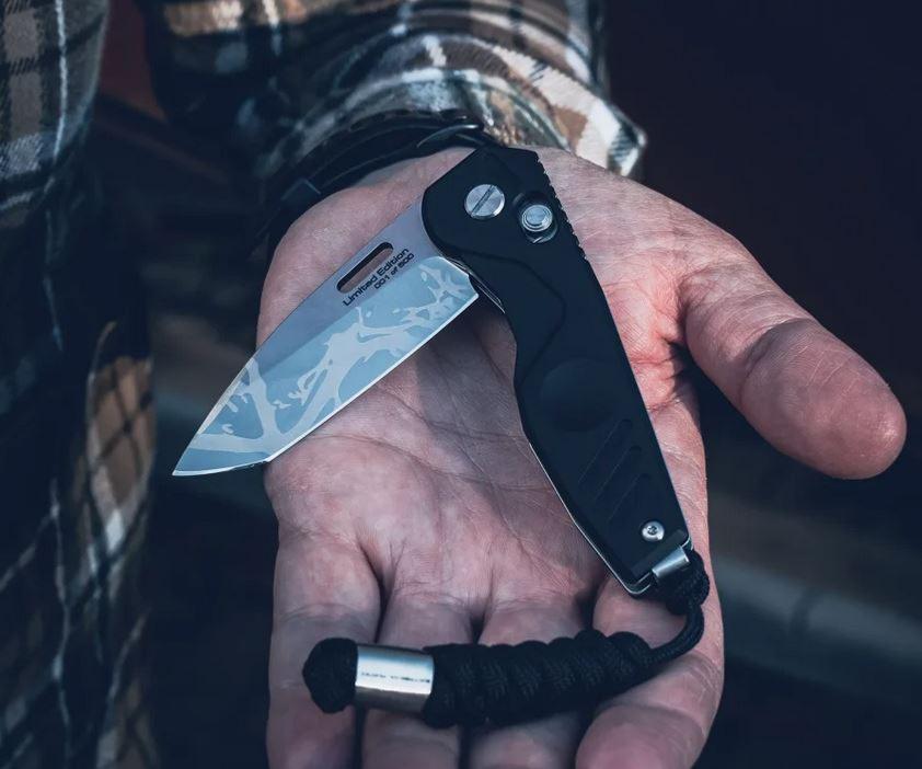 Des gravures laser dédiées sur la lame et le clip confèrent au couteau une identité forte et confirment son appartenance à la série.