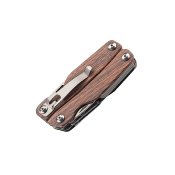 Une pince à bec effilé à ressort avec coupe-câble, lame de couteau, scie à bois avec liner-lock, poinçon, tournevis avec ouvre bouteille, ouvre-boîte avec encoche de dénudage, un oeillet, un tourneviscruciforme et une lime