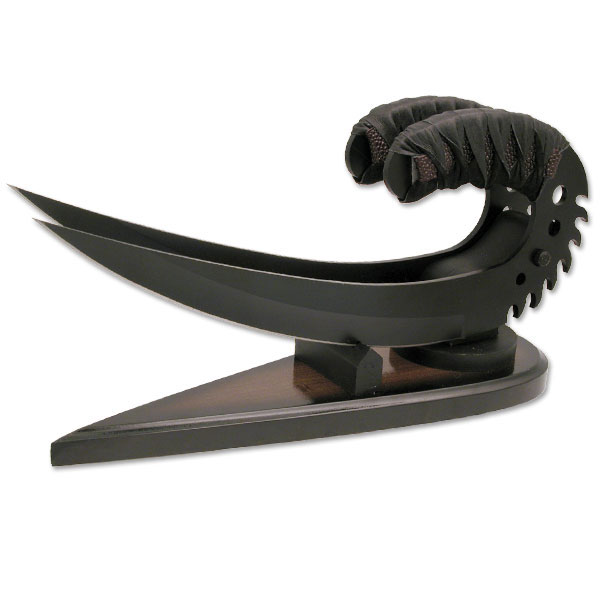 Construit d'une seule pièce en acier 420 J2, longueur totale 30 cm, poignée recouverte de cuir, les lames sont légèrement affûtées