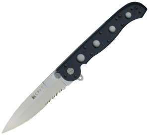 Lame semi-dentée acier AUS 6M satiné à cran intérieur et à bouton et système de blocage LAWKS, manche 12 cm zytel noir avec clip.