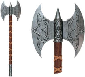2 lames latérales de 20 cm en acier finition antique non affûtées, longueur totale 71 cm, manche bois entrelacé de lanières de cuir, poids 1,4 kg