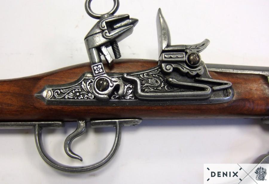 L'arme à feu la plus utilisée par des pirates au XVIIIe siècle. Ils avaient une pierre de silex, qui lors de l'utilisation du marteau produisait l'étincelle d'allumage. Il fallait recharger manuellement après chaque tir.
