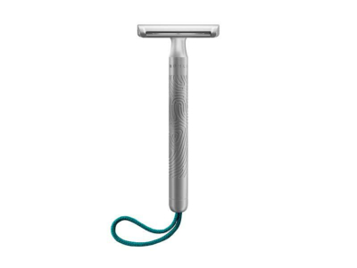 Rasoir de sécurité unisexe MUHLE Companion pour le rasage du corps et du visage, peigne fermé, manche métal mat avec surface anti-dérapante en forme d'empreinte digitale, avec cordon de suspension turquoise 100 % coton.