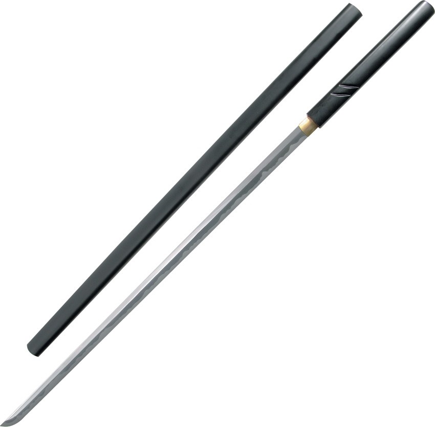 Lame de env 72 cm en acier forgé T10 à haute teneur en carbone trempé avec ligne de trempe, poignée bois laqué noir, longueur totale env 102,8 cm, fourreau bois laqué noir.