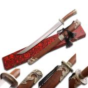 Lame 51,5 cm en acier Damas légèrement affutée, manche bois, garde et pommeau en métal, longueur totale 67,5 cm, livrée avec fourreau bois.
