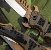 Le couteau de poche USMC Desert Ops est officiellement autorisé par les Marines afin que vous puissiez être assuré qu'il est à la hauteur de tous les défis ! La lame bicolore, beige désert et argent, est en acier inoxydable 3Cr13 et comporte les mots « Honneur, Courage, Engagement ».