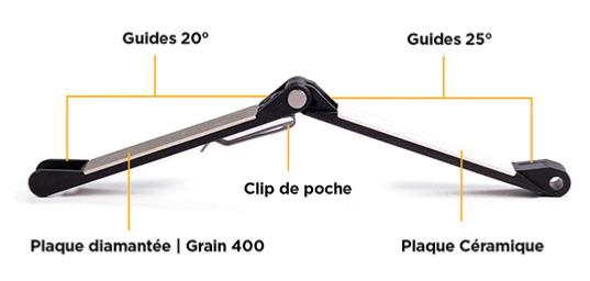 • La plaque d'affûtage en céramique avec guides à 25° polit et affine les tranchants sans eau ni huile.